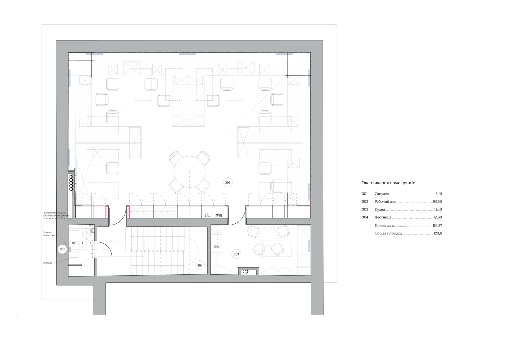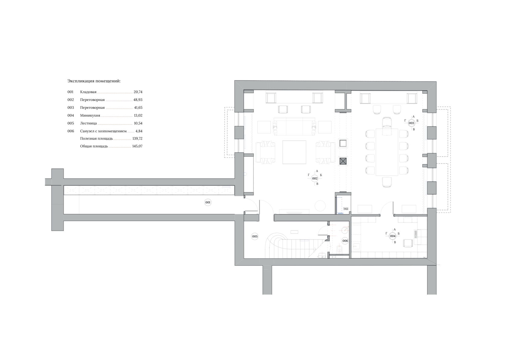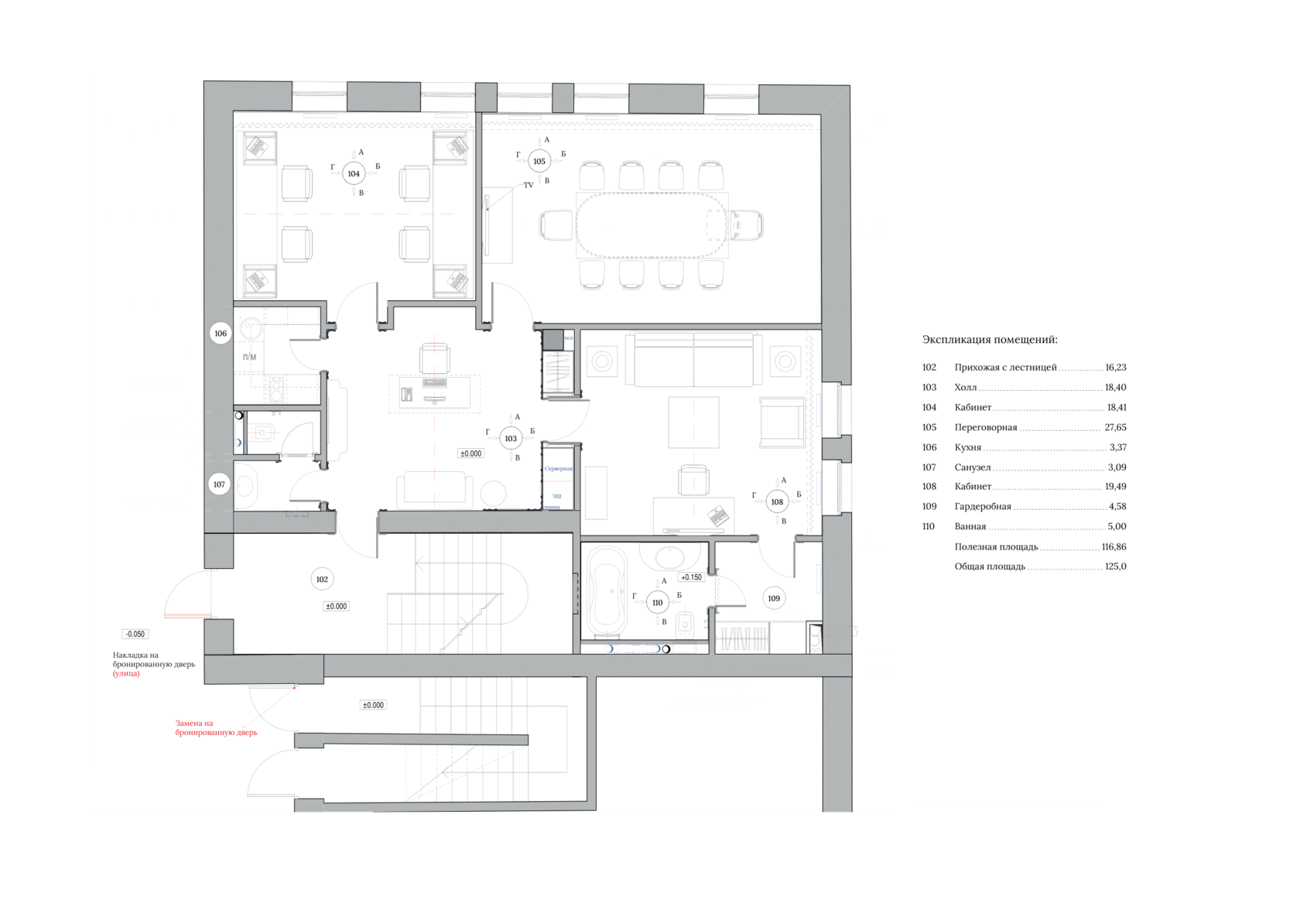 Планировочные решения многофункционального характера: общественная зона на 1 и -1 этажах, приватная зона - на втором, на каждом этаже есть кухня, с/у, комнаты для переговоров, работы и отдыха.